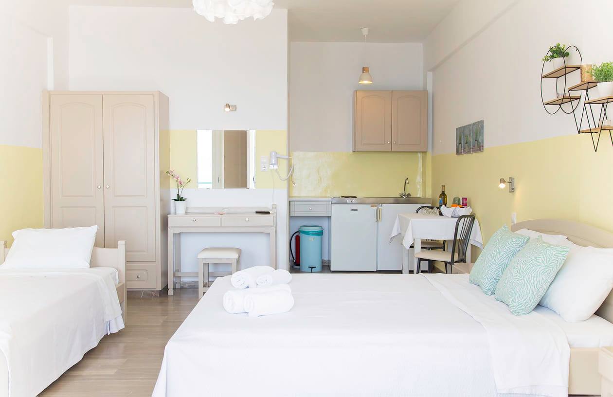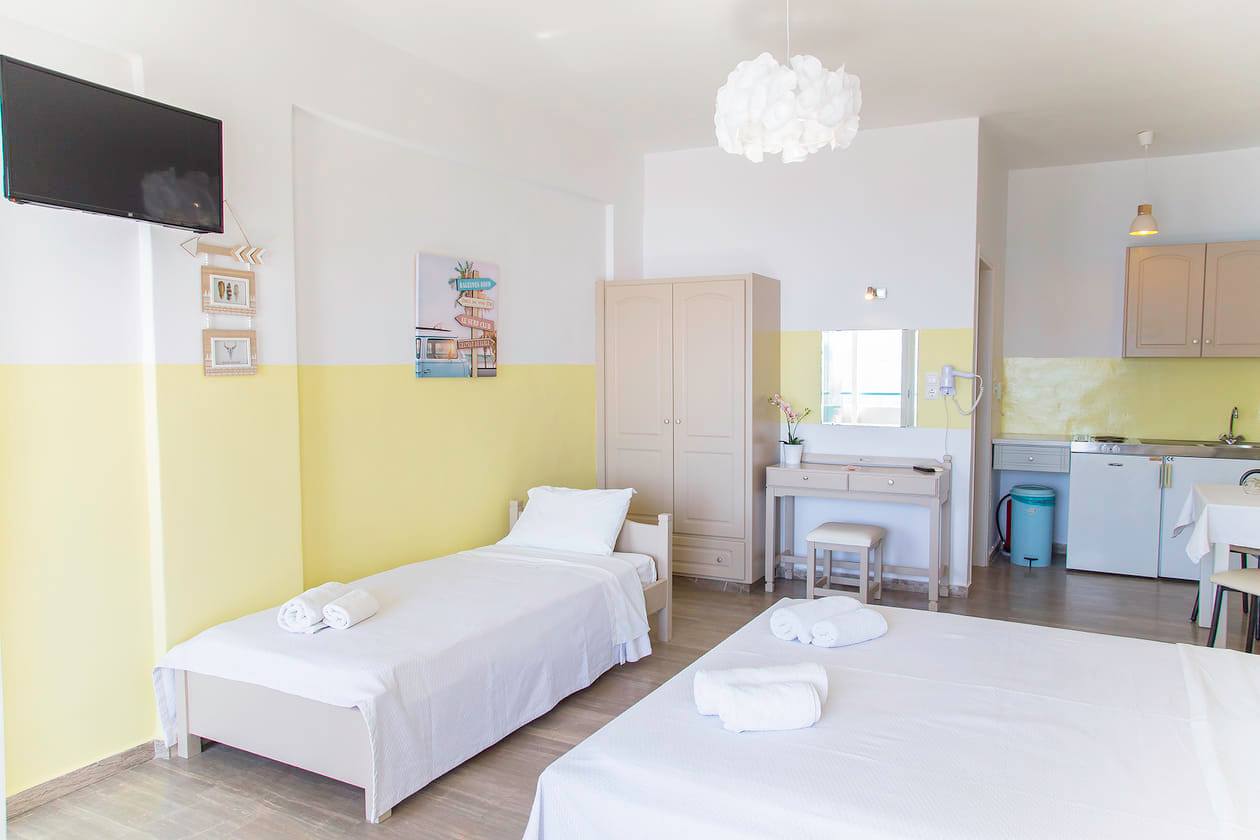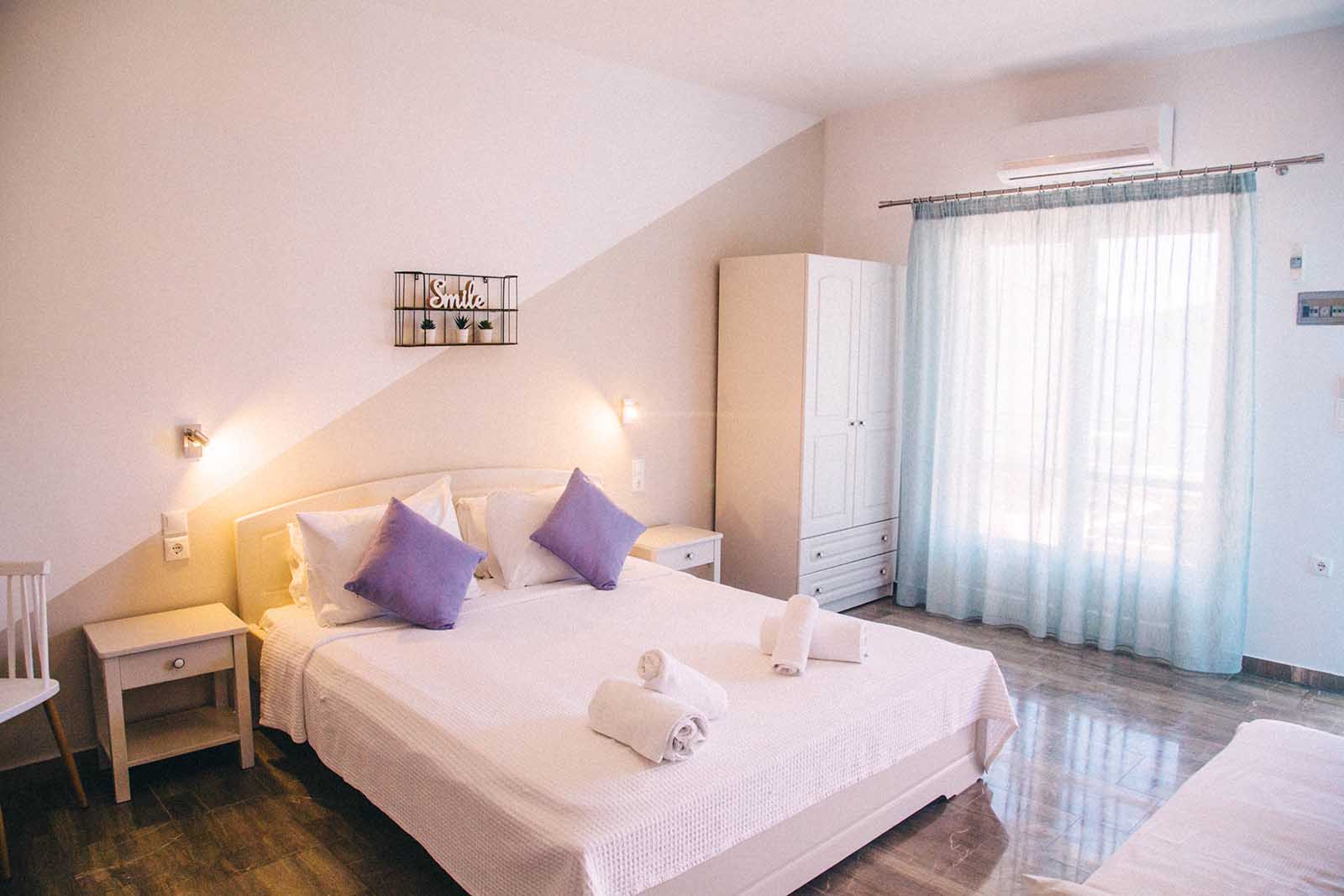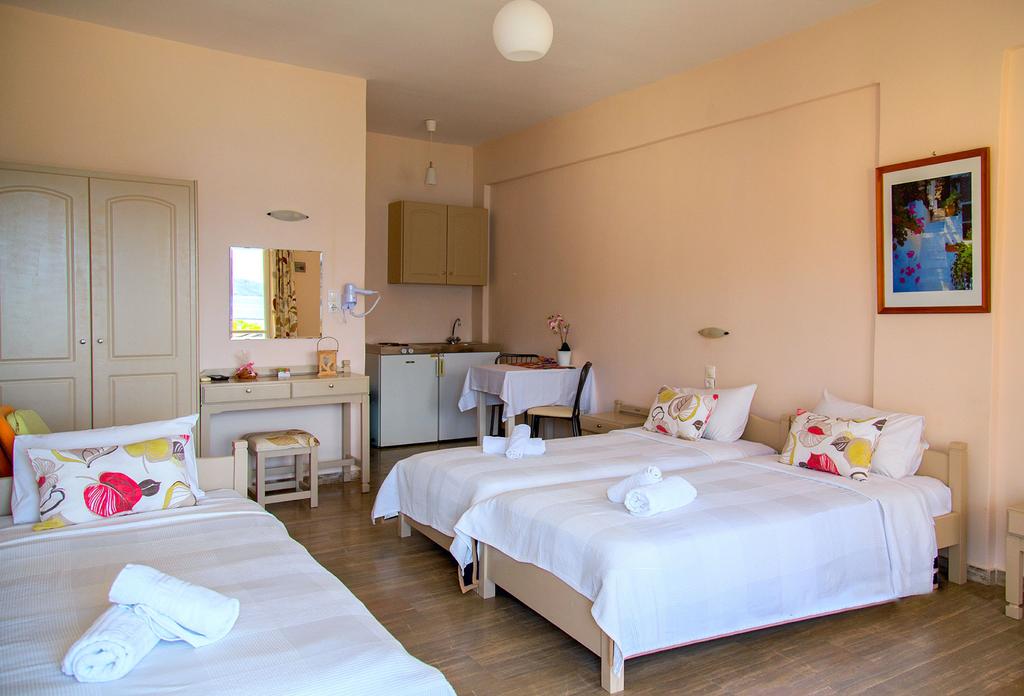 Απολαμβάνοντας την αύρα του κόλπου του Ασκελιού, ο επισκέπτης έχει στη διάθεσή του σύγχρονες παροχές, σ’ένα μοναδικό περιβάλλον 30 μέτρα από τη παραλία, 2 χλμ από το κέντρο του νησιού, 50 μέτρα από τα Super Market και μόλις 20 μέτρα από το εστιατόριο μας «Πανόραμα», όπου σερβίρεται και το πρωινό.